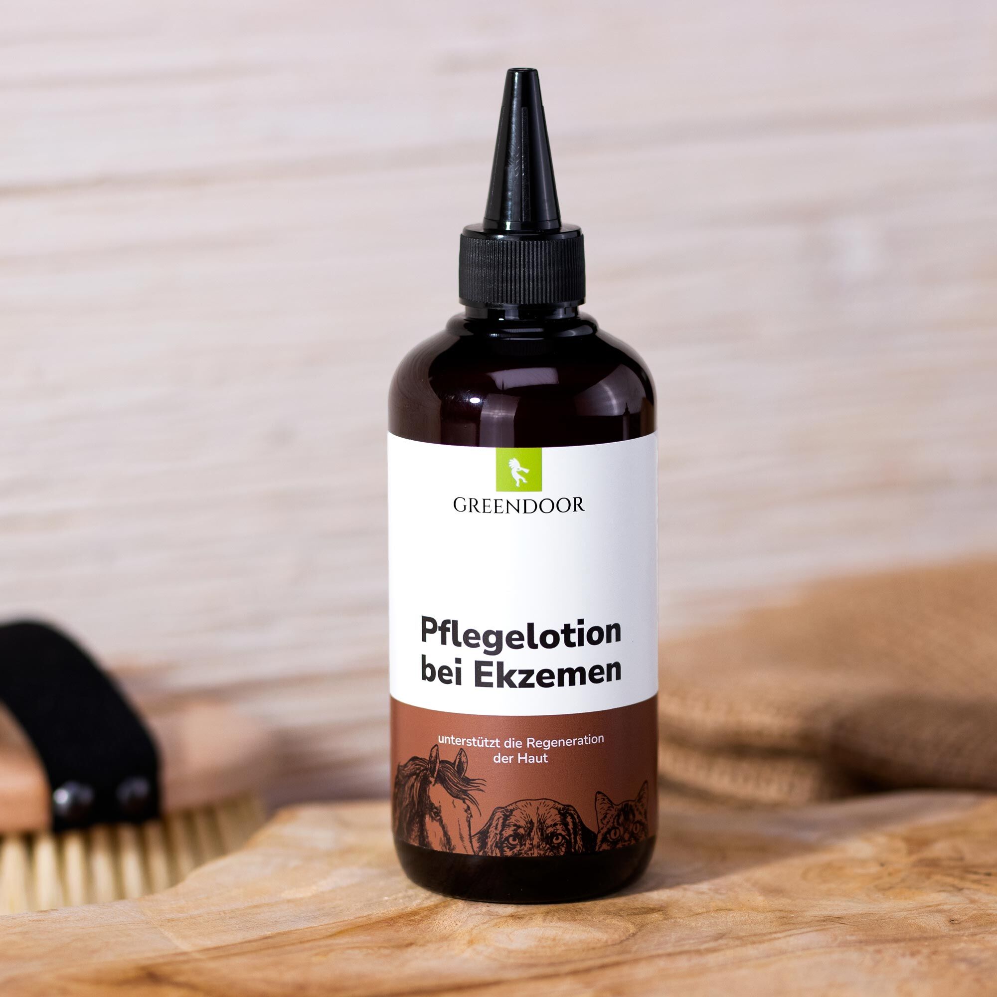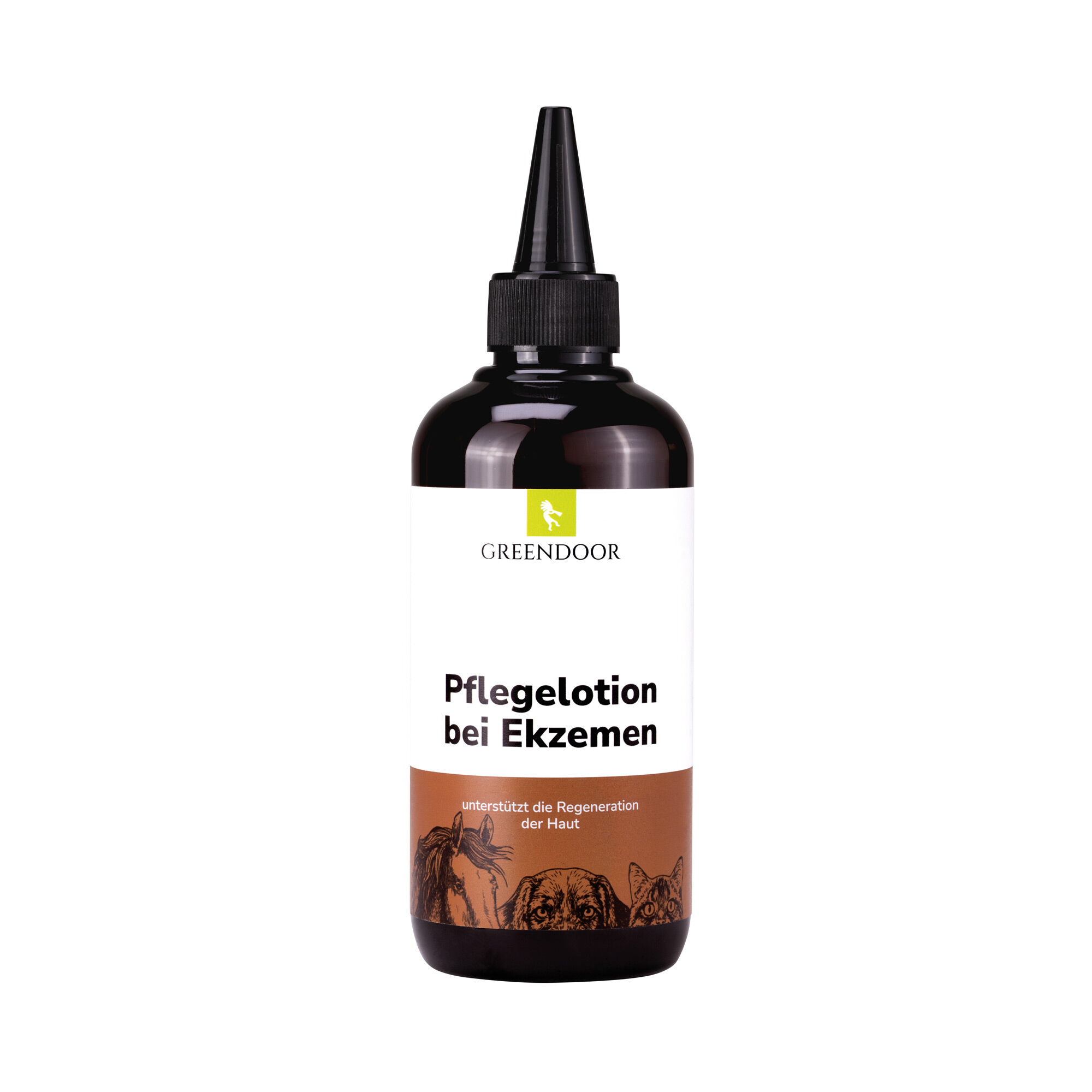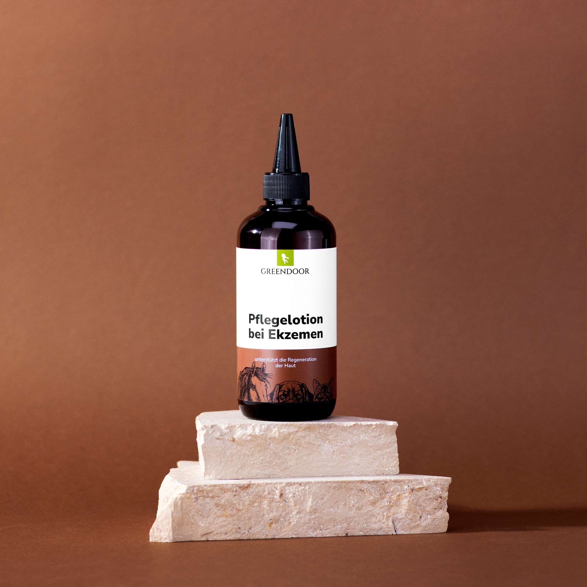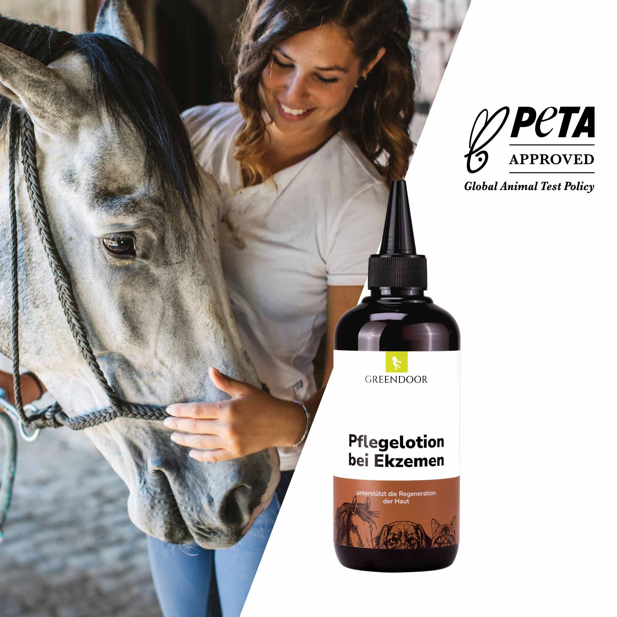 GREENDOOR Pflegelotion bei Ekzemen für Pferde ist ein innovatives, hochwirksames Pflegemittel bei allen Ekzem-Arten wie Neurodermitis, Dermatitis, Juckreiz, Hautreizungen und Schuppenflechte. Es schützt vor bakteriellem und mikrobiellem Befall.