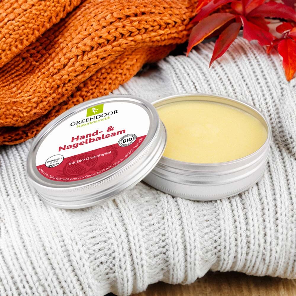 Damit Sie spröden Händen im Herbst vorbeugen können, empfehlen wir Ihnen Ihre Haut für ideale Elastizität mit wertvollen Ölen zu versorgen. Unser feuchtigkeitsspendender Hand- und Nagelbalsam pflegt und schützt Ihre Hände mit reichhaltigem Bio Granatapfelöl. Die enthaltene Avocadobutter verwöhnt Ihre Hände zudem mit Vitamin A, E und D.