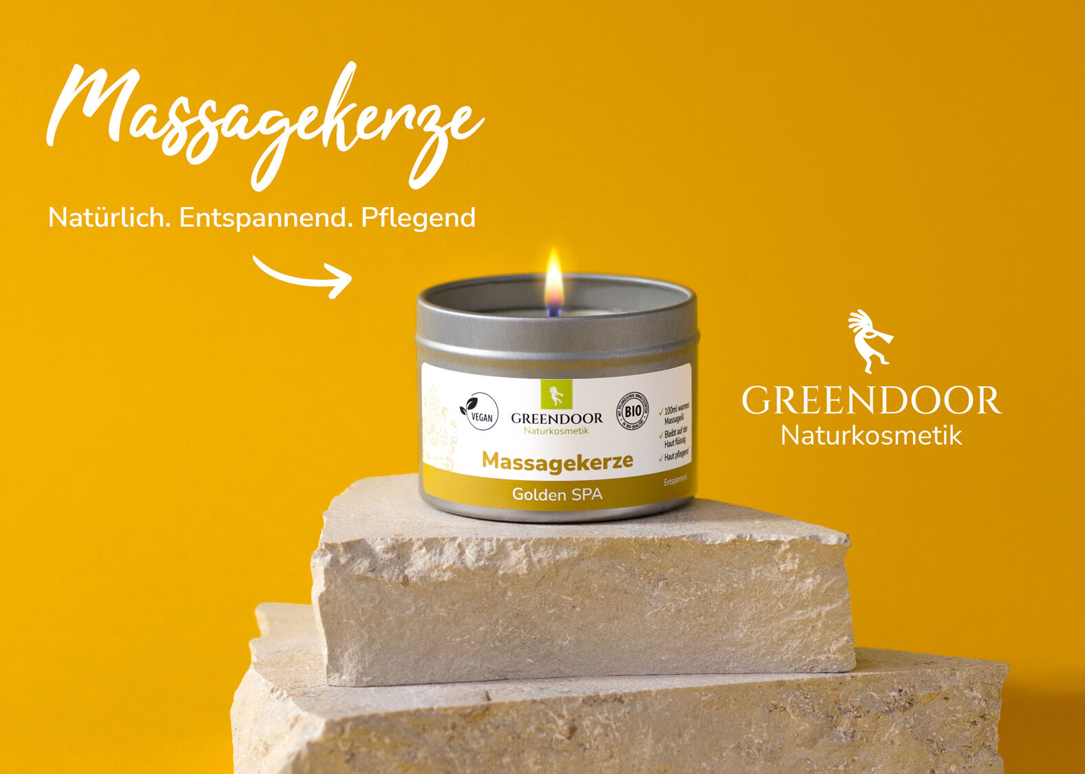 Nach 10-15 Minuten Zeit der Vorfreude ist genug Wachs für eine Massage geschmolzen. Kerze löschen und das flüssige Wachs in die Handfläche gießen. Das Wachs einer GREENDOOR Massagekerze ist nur so warm, wie ein heißes Bad. Los geht's mit der Massage! Das natürliche GREENDOOR Rezepturgeheimnis sorgt dafür, dass das entstehende Massageöl auf der Haut nicht mehr fest wird und bei der Massage in die Haut einzieht.