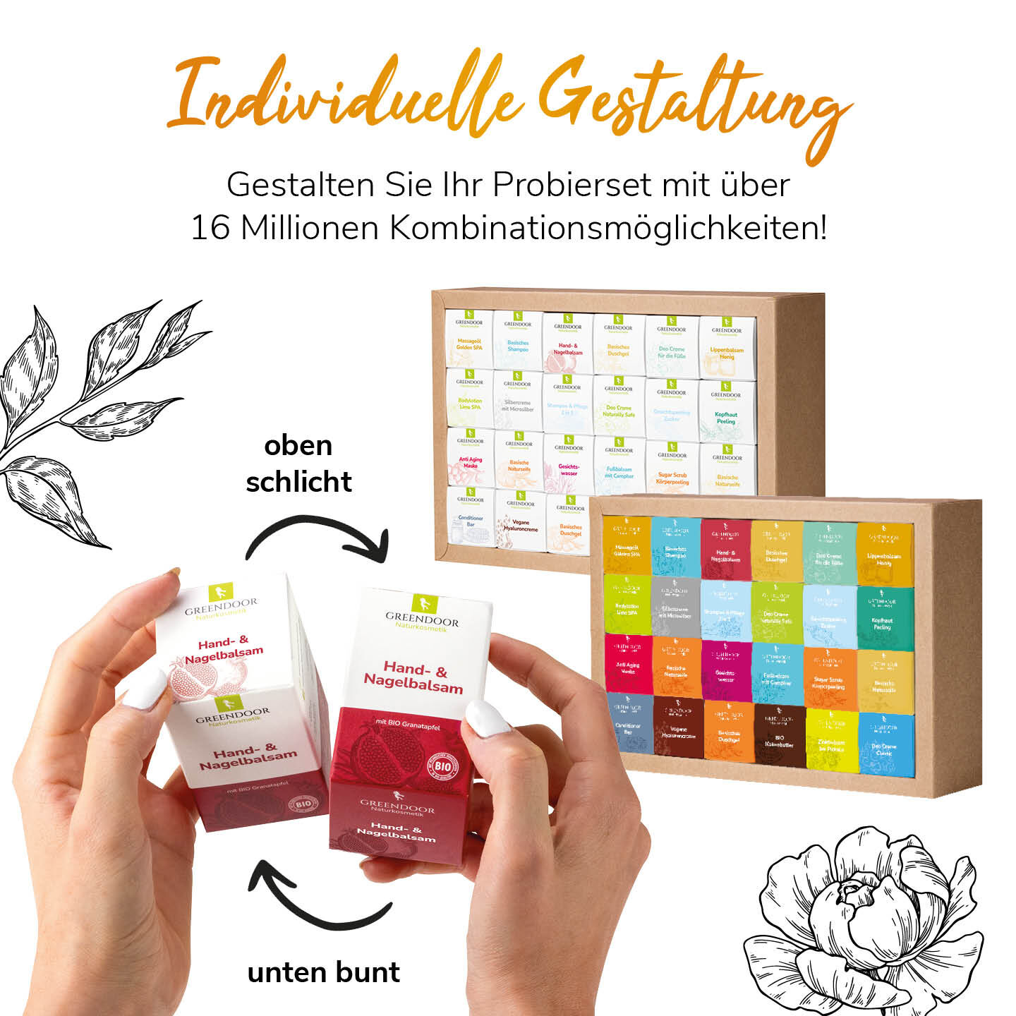 Das elegante Design unseres Sets macht es zu einem stilvollen Ostergeschenk. Die 24 liebevoll gestalteten Verpackungen präsentieren zwei verschiedene Motive, die es Ihnen ermöglichen, das Set individuell zu gestalten und zu einem einzigartigen Blickfang zu machen. Mit unserem Ostern-Probierset schenken Sie nicht nur hochwertige Pflegeprodukte, sondern auch die Freude, viele unserer Naturkosmetikprodukte in praktischen Probiergrößen zu entdecken und auszuprobieren.