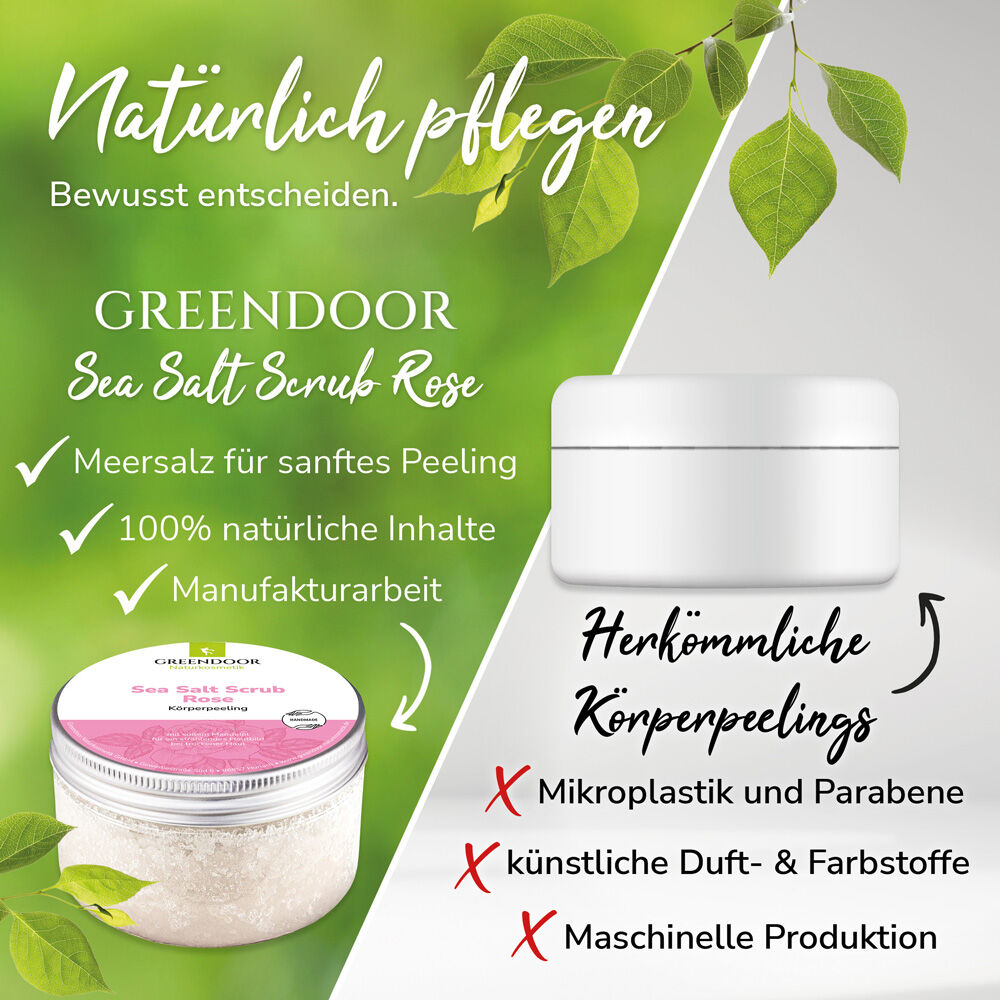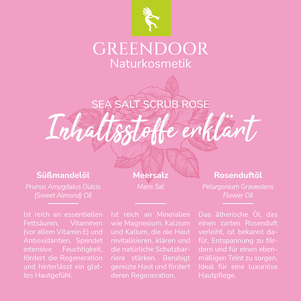 - Sichtbare Ergebnisse: Ihre Haut fühlt sich glatter, zarter und sichtbar gepflegter an. Natürliche Pflege ohne Kompromisse Der GREENDOOR Sea Salt Scrub Rose enthält keine Konservierungsstoffe, Mikroplastik oder synthetische Duftstoffe. Er ist 100 % natürlich und wird mit viel Liebe in unserer Manufaktur in Deutschland hergestellt.