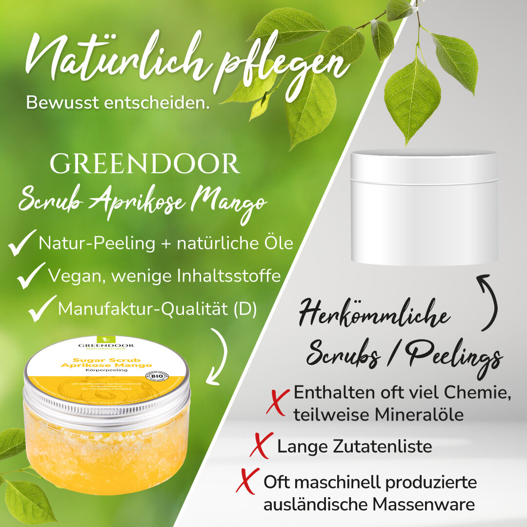 Fruchtig duftendes sanftes Peeling auf Basis definierter Zuckerkristalle und besonders pflegendem, wertvollem Aprikosenkernöl und Karottenöl. Der GREENDOOR Sugar Scrub ist ein traditionelles Peeling in moderner Interpretation, das die Haut von bereits abgestorbenen Hautschüppchen befreit und gleichzeitig intensiv pflegt und nährt.
