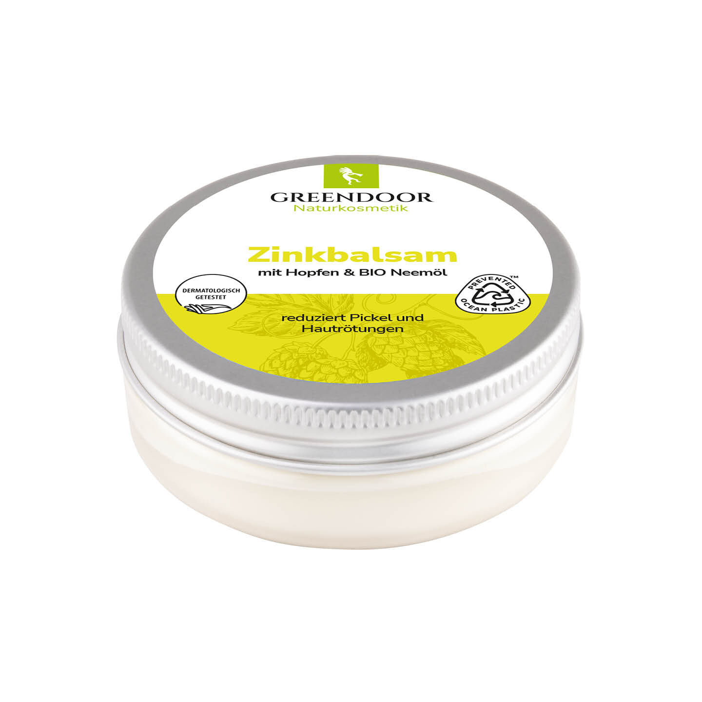 Natur pur - ganz natürlich. Es gibt viele Zinksalben, Cremes mit Zink und andere Zink-Produkte. Vergleichen Sie. Bei GREENDOOR Zinkbalsam können Sie sicher sein: Natur pur, reine natürliche Inhaltsstoffe, natürlich keine Tierversuche, keine Parabene, keine anderen Konservierungsmittel, keine synthetischen Farbstoffe, keine Parfumstoffe, keine Paraffine oder andere Mineralölrohstoffe. Dafür enthält er einen hohen Anteil hochreines Premium Zinkoxid, BIO Kokosöl, BIO Sesamöl, kaltgepresstes BIO Neemöl, Hopfen und Salbei.